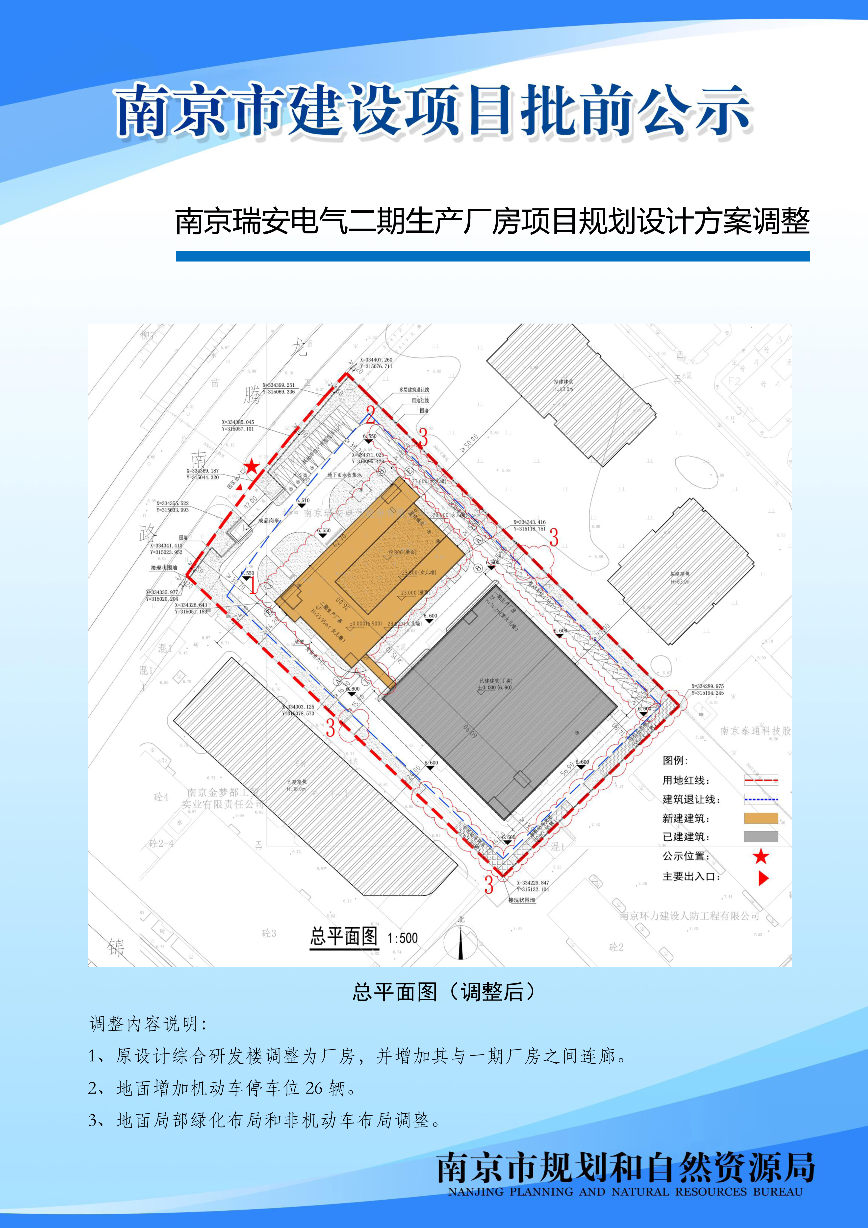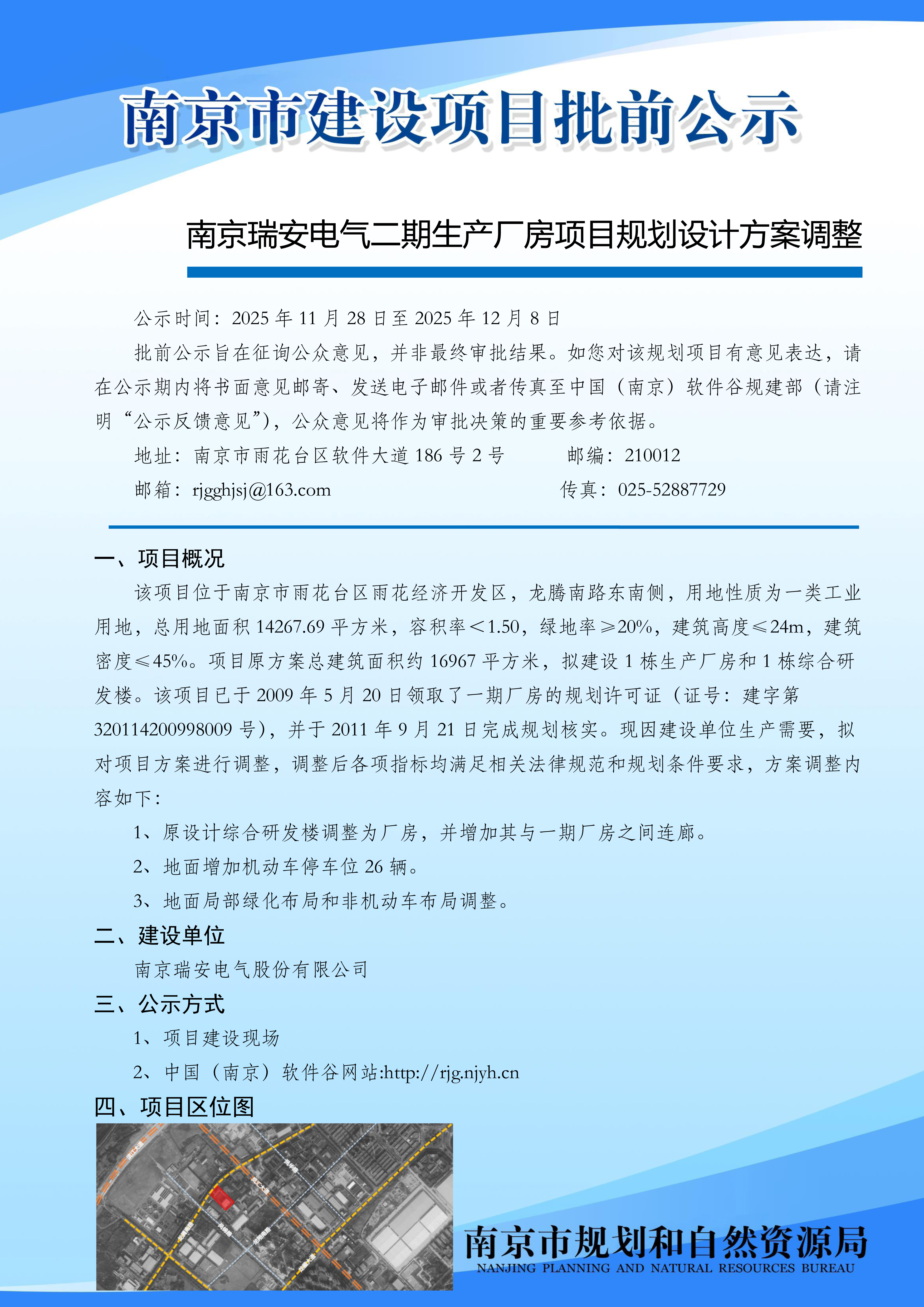 南京瑞安电气二期生产厂房项目规划设计方案调整批前公示(公示时间:2025.11.28-2025.12.08)